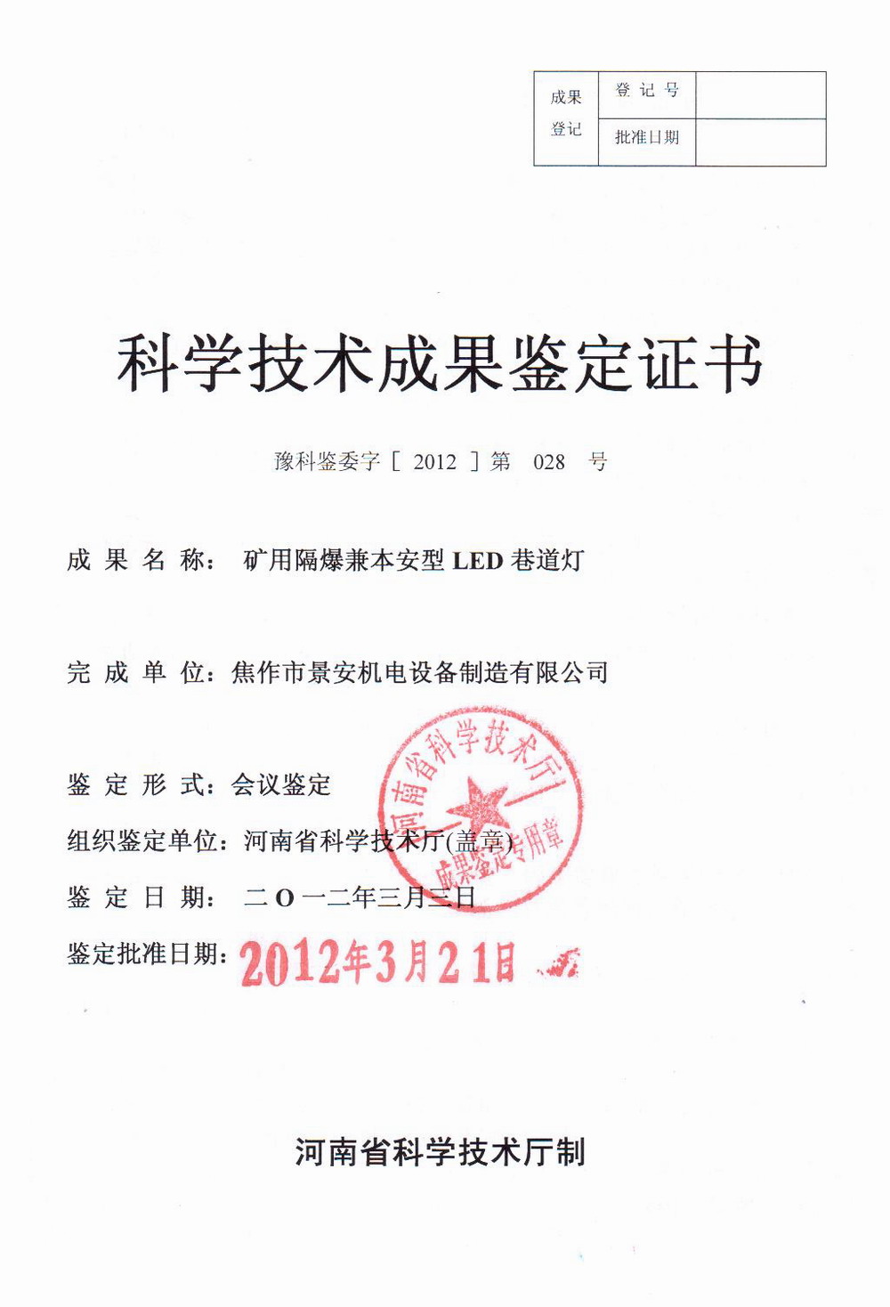 2012321,我公司研制開發(fā)的“礦用隔爆兼本安型LED巷道燈”項目通過河南省科技廳組織的科技成果鑒定,鑒定委員會一致認(rèn)為:本項目達(dá)到同類產(chǎn)品國內(nèi)領(lǐng)先水平。該項目采用本質(zhì)安全電源技術(shù),設(shè)計了本質(zhì)安全型疊加恒流源電源,使燈具運行穩(wěn)定、安全、可靠;采用防靜電技術(shù)設(shè)計了光學(xué)透明罩和防塵罩;進(jìn)行了合理的結(jié)構(gòu)設(shè)計,金屬防護(hù)外殼為LED光源散熱,保證燈具連續(xù)使用下微光衰,長壽命,并且具有良好的防塵、防水、防腐性能。